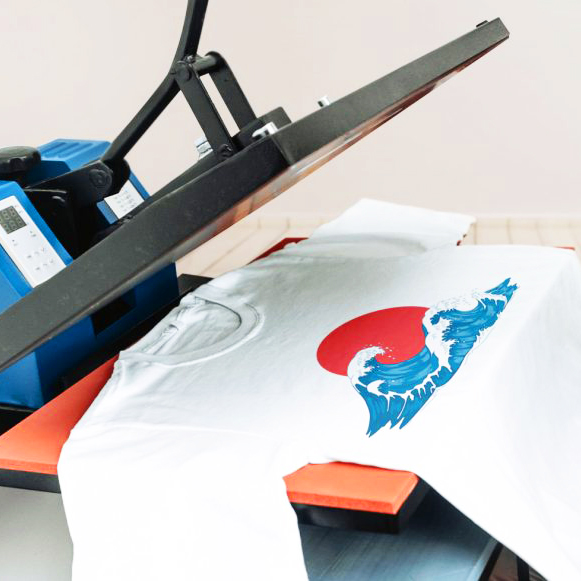 like fabric, metal, or ceramics through a heat press. Unlike traditional